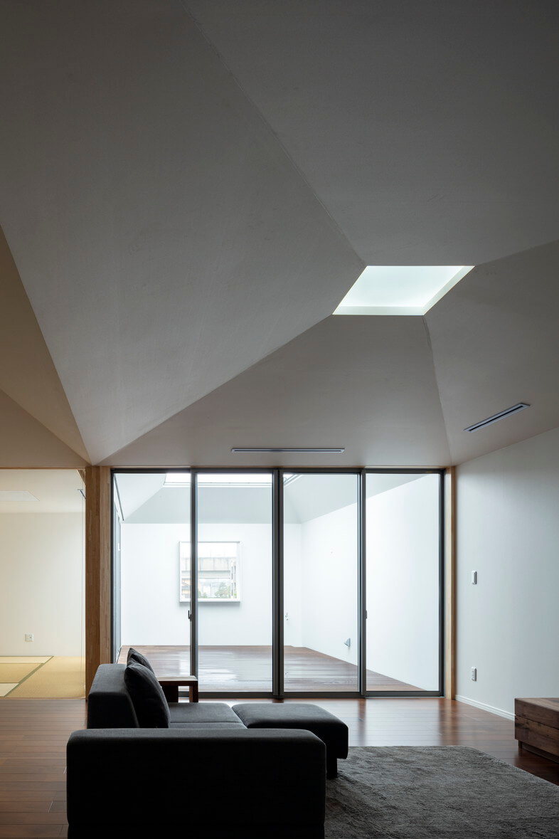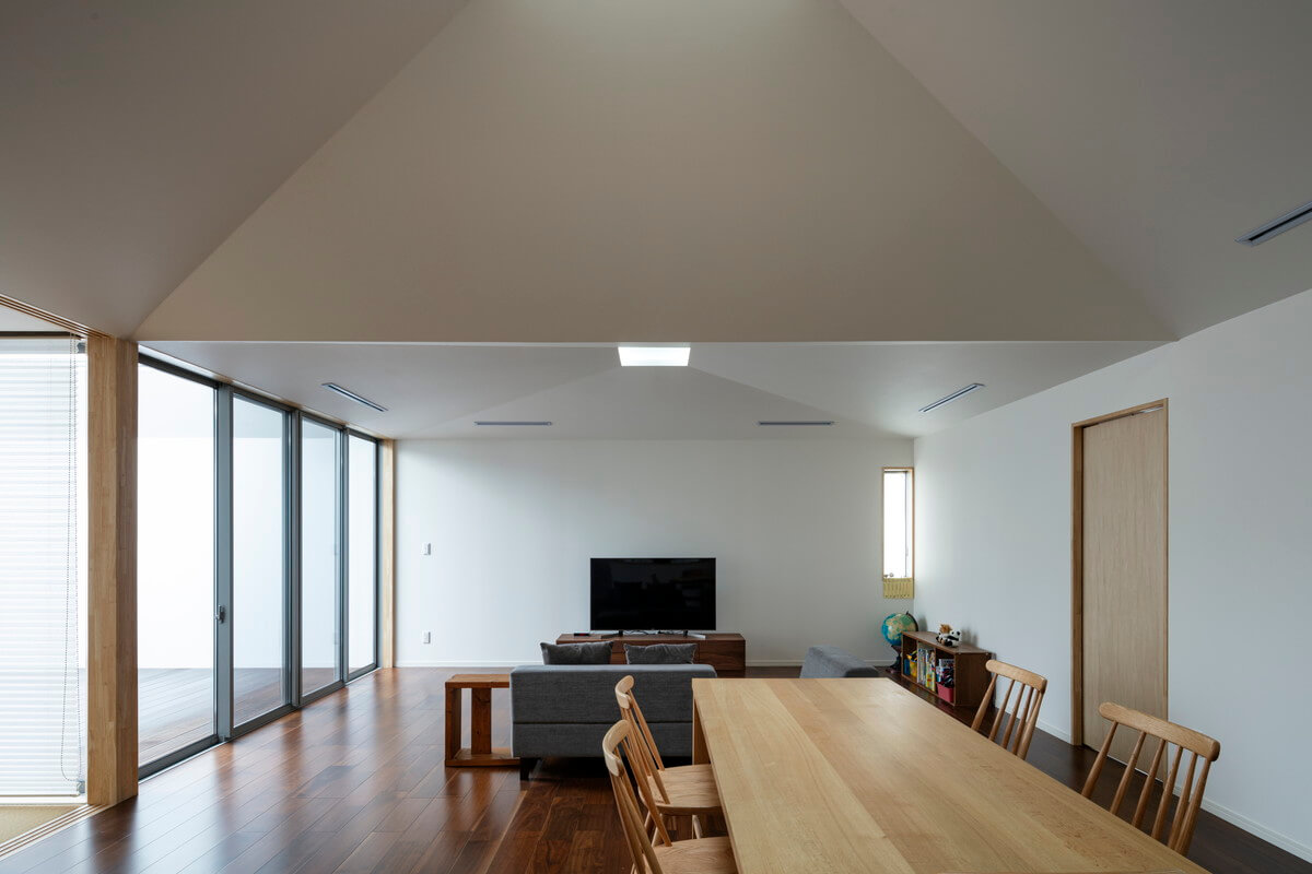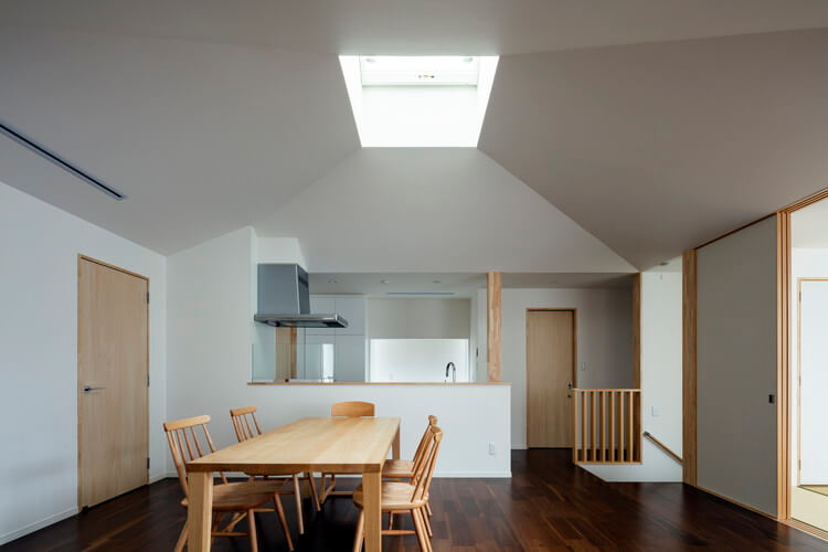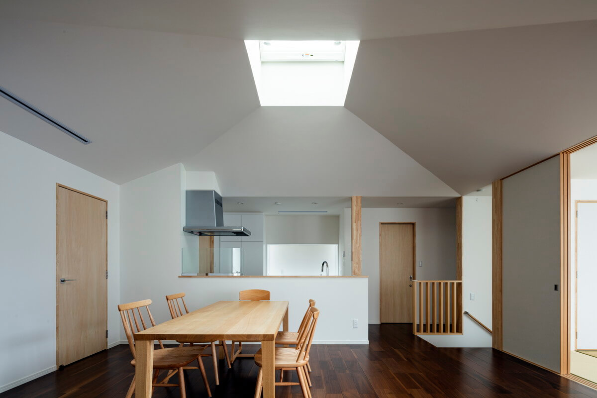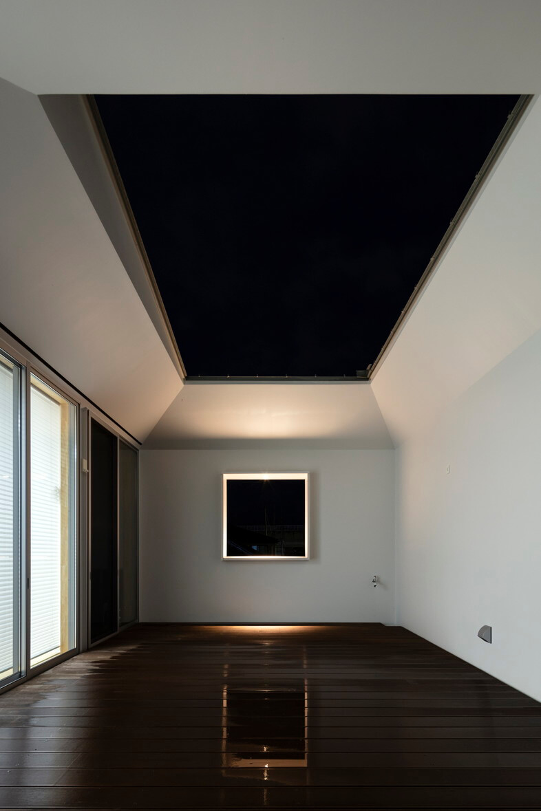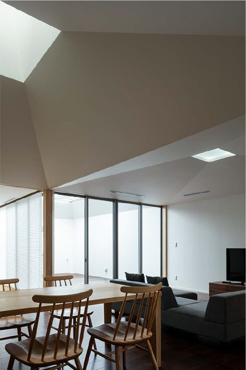 白い外壁に慎重に最小限の窓を設け、トップライトからの光が印象的に漏れるLDKとしています。